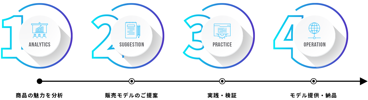 貴社の商品の魅力を分析、価値上げ・利益創出を最大限に膨らませるオムニチャネルリテイリング(販売モデル/販売施策)をご提案、当社が保有する全国各地のマーケティングチャネルを駆使し、貴社サービスの全国販売ネットワーク網を構築し、現地まで実際に足を運んで、販売モデルに基づき実践、収益化が現実のものとなる事を確信してから、お客様にノウハウごと納品いたします。